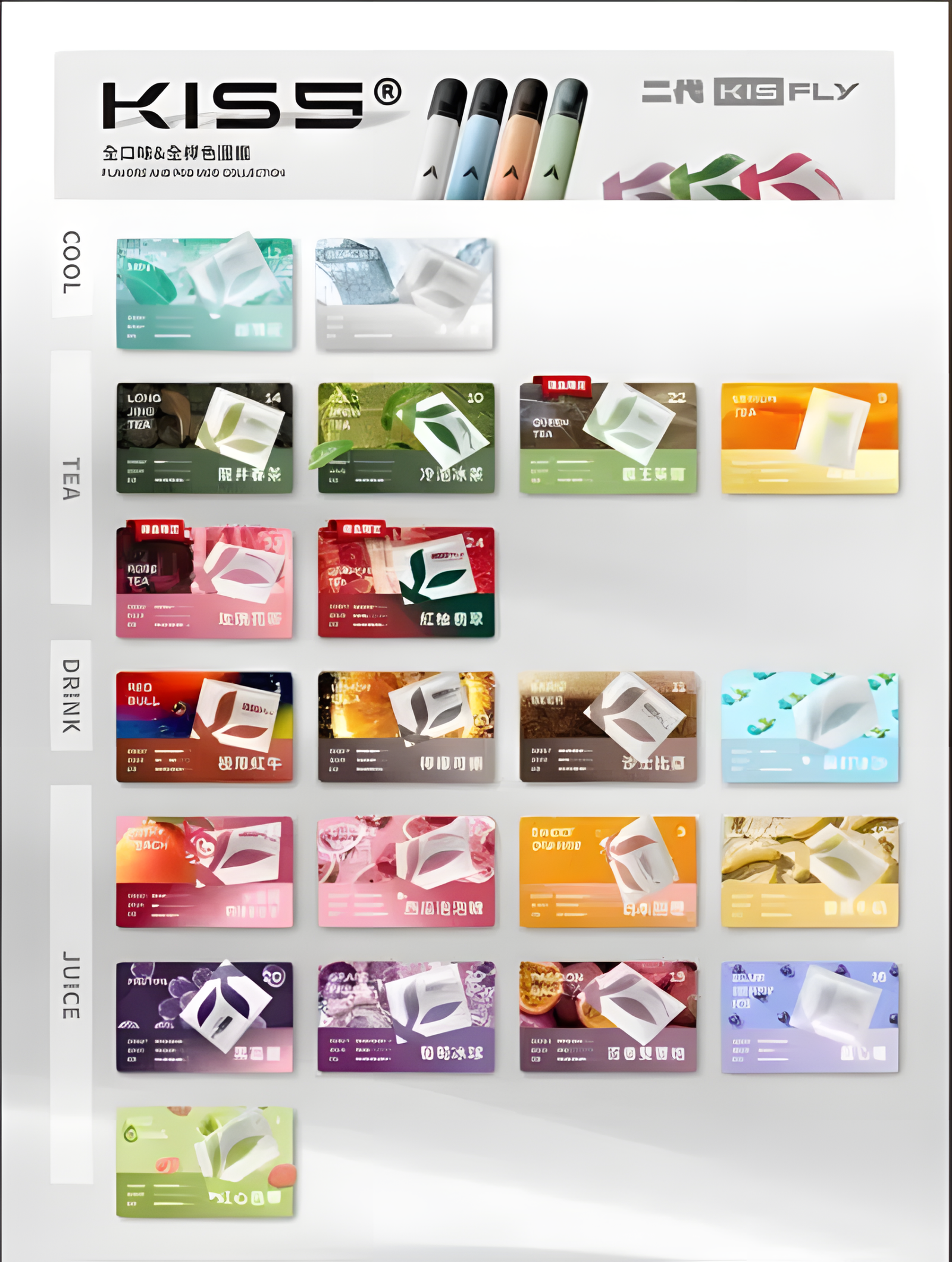 | 口味 | 冰河水, 檸檬可樂, 葡萄冰球, 冷泡冰茶, 水蜜桃, 藍莓, 日本甜橙, 沙士比亞, 蘇打冰沙, 極限紅牛, 檸檬冰茶, 百香果雙響炮, 紅心芭樂, 西瓜泡泡糖, 買五送主機(專機專用), 超薄荷, 香蕉牛奶, 黑嘉麗, 龍井春茶 |