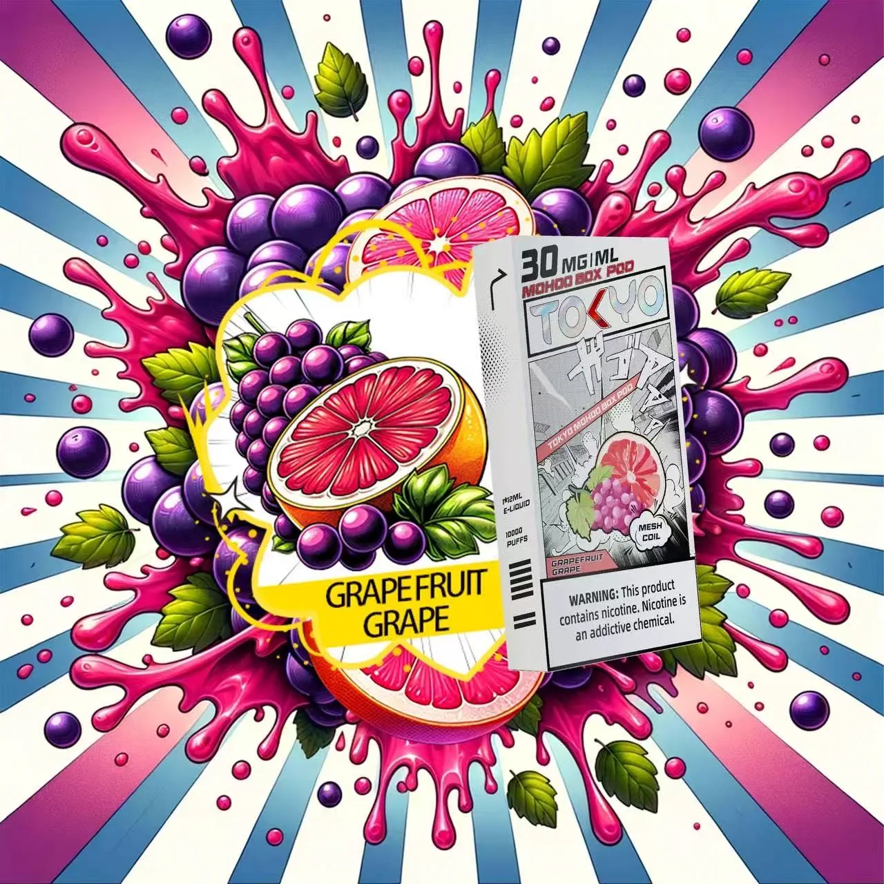 東京魔盒電子煙煙彈採用植物甘油與丙二醇基底,搭配高純度尼古丁鹽,容量 12mL、尼古丁強度 30mg/mL(3%),內建 1.0Ω 鋼網棉霧化芯,設計為一次性 pod,約可在 10,000 口,吸引力持久。